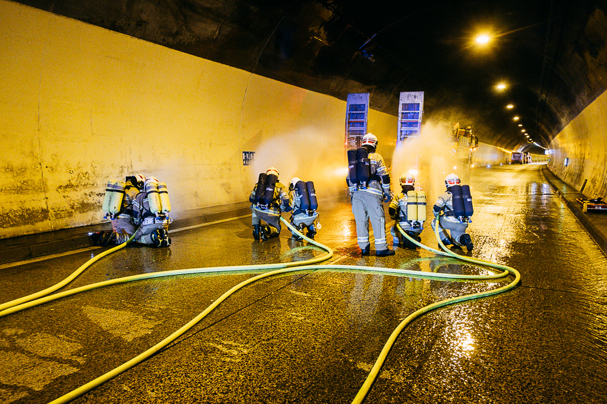 Dieses Übungsszenario war ein Ausschnitt aus einem Brandeinsatz im Tunnel, im Ernstfall und je nach Lage werden mehrere Einsatzkräfte beteiligt sein und auch beide Tunnelröhren für den Verkehr gesperrt sein. Somit sind Fluchtwege frei und für Einsatzkräfte wird es möglich auch durch Querstollen effizient zum Einsatzort zu gelangen.