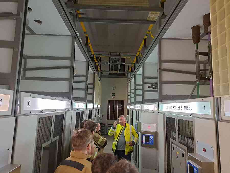 Die Mannschaft wurde geteilt; eine Gruppe führte eine Personenrettung von einem 110KV-Transformator durch, der für diese Übung extra vom Netz genommen wurde. Die andere Hälfte besichtigte das Gebäude, in welchem der Strom auf die einzelnen 30KV-Leitungen verteilt wird. Anschließend wechselten die Gruppen.
