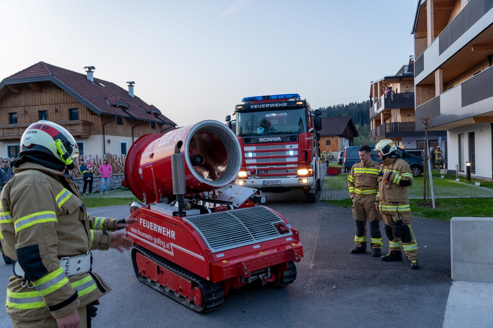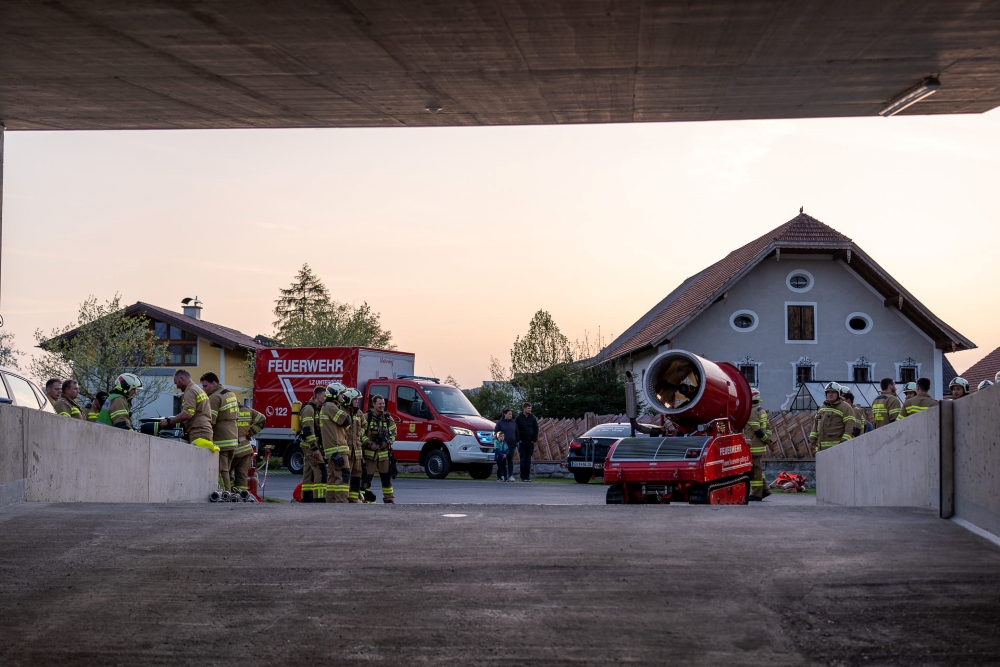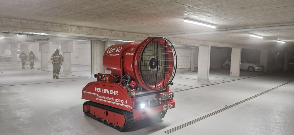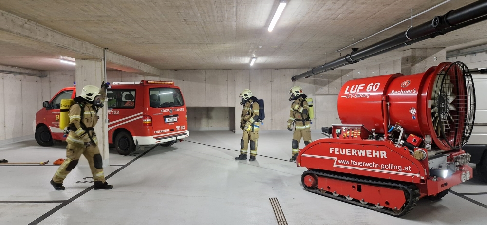 Übungsannahme war ein Brand eines Elektrofahrzeuges in einer neu errichteten und weitläufigen Tiefgarage. Mittels LUF 60 der Feuerwehr Golling wurde, nach der erfolgreichen Brandbekämpfung durch die örtlichen Kräfte, die Tiefagrage belüftet und entraucht. Im Anschluss wurde das ausgebrannte Fahrzeug mit der Seilwinde des Löschunterstützungsfahrzeuges geborgen.