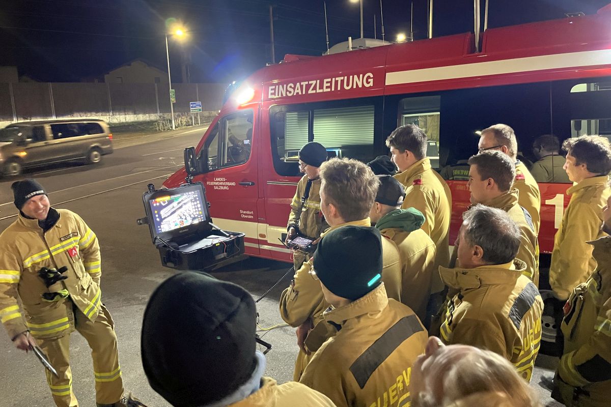 Zuerst gab Kamerad OVI Johannes Winkler von der FF Oberalm eine theoretische Einführung. Es wurden viele mögliche Einsatzszenarien erläutert. Dabei wurde auch auf die Bedeutung des Einsatzleitfahrzeuges und der Drohne für den überbehördlichen Einsatz (z.B. Unterstützung der Berg- oder Wasserrettung) eingegangen.