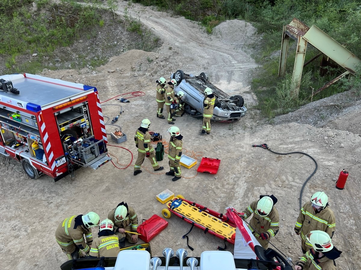 An diesem Donnerstag wurde das Thema „Schwerer Verkehrsunfall mit eingeklemmter Person“ behandelt. Dazu wurden in einem Steinbruch zwei Fahrzeuge platziert, an denen die aktive Einsatzmannschaft mehrere Rettungstechniken üben konnte.