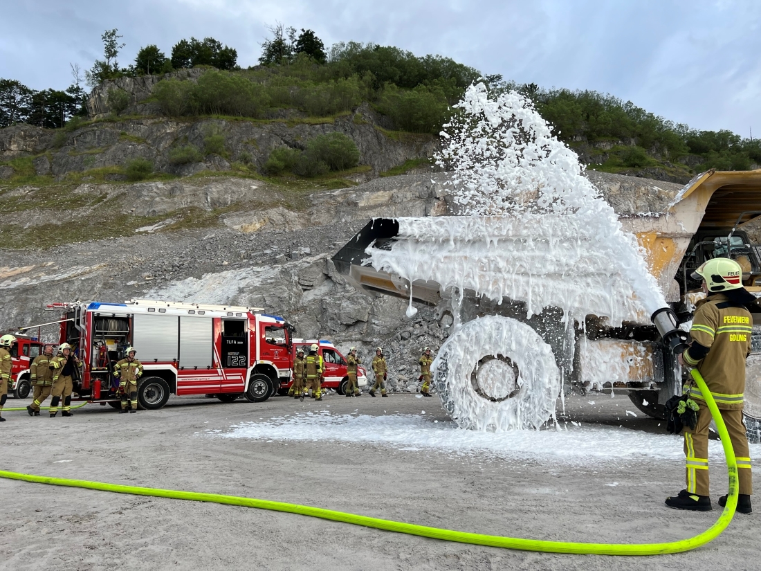 Übungsannahme bei dieser Zugsübung war ein Brand eines Muldenkippers im Steinbruch der Firma Leube. Der Fahrer befand sich noch im Fahrzeug und musste von den Einsatzkräften gerettet werden.