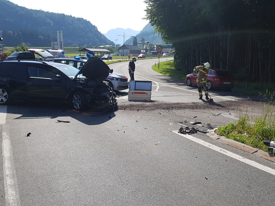 Zwei Fahrzeuge prallten in der unübersichtlichen Kreuzung aufeinander. Die drei leicht verletzten Personen wurden bereits von den Kräften des Roten Kreuzes betreut und die Polizei hatte bereits begonnen die Unfallstelle abzusichern. Die Aufgabe der Feuerwehr Golling bestand in der Absicherung der Unfallstelle und Errichtung des Brandschutzes. Zusätzlich wurden die Batterien der Fahrzeuge abgeklemmt und die Fahrbahn gereinigt. Ein Unfallfahrzeug kam auf der Leitschiene zum Stillstand. Dieses wurde von der Mannschaft von Rüst Golling gesichert und anschließend wieder auf die Fahrbahn gezogen. Nachdem die Unfallfahrzeuge neben dem Fahrbahnrand sicher abgestellt und dem Abschleppdienst übergeben wurden, war der Einsatz für die Kräfte der Feuerwehr Golling nach ca. 1,5h beendet.