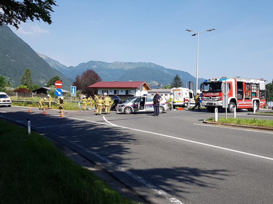 Am 19.06.2021 um 9.15 Uhr wurde die Feuerwehr Golling zu einem Verkehrsunfall im Bereich der Kreuzung B159 / Autobahnzubringer alarmiert. Binnen weniger Minuten rückten Voraus, Tank 2, Rüst und Tank 1 Golling mit 20 Mann zur Unfallstelle aus.