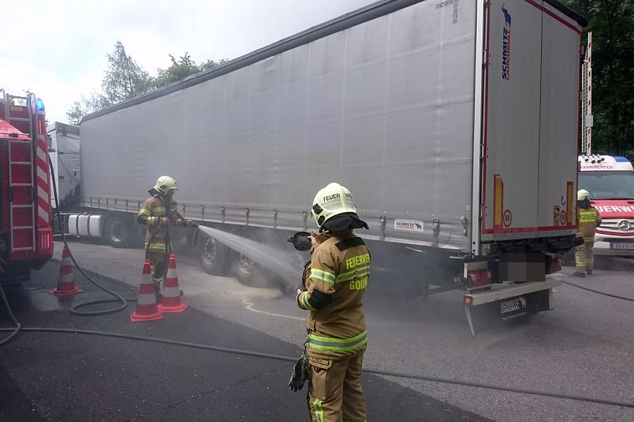 Der LKW-Fahrer fuhr mit seinem rauchenden Auflieger noch aus dem Tunnel in die Ausfahrt einer Betriebsumkehr. Glücklicherweise hatten die überhitzten Bremsen noch nicht Feuer gefangen. Vor dem Eintreffen der Feuerwehr hatte der LKW-Fahrer bereits einen Pulverlöscher eingesetzt. Die Mannschaft des ersten Tanklöschfahrzeugs kühlte die Bremsen sofort mit zwei HD-Rohren.