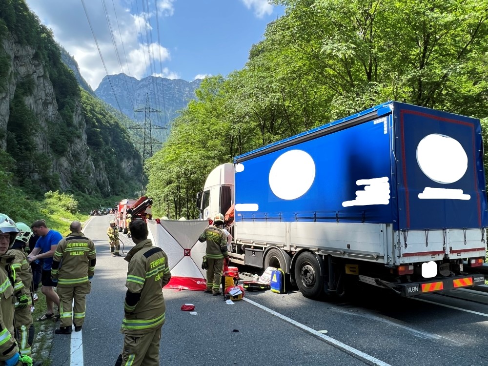 Vor Ort angekommen stellte sich heraus, dass es sich nicht um einen Verkehrsunfall zwischen PKW und LKW handelte, sondern dass ein Radfahrer beim queren der Straße von einem LKW erfasst und dabei schwer verletzt wurde. Da keine technische Menschenrettung notwendig war, lagen die Aufgaben der Feuerwehr Golling beim Absichern der Unfallstelle. Dazu wurde der Brandschutz errichtet, ein Sichtschutz aufgebaut, der Verkehr geregelt sowie Notarzthubschrauber „Martin 1“ an der Unfallstelle eingewiesen. Zusätzlich wurde bei der Versorgung des verunfallten Radfahrers unterstützt.