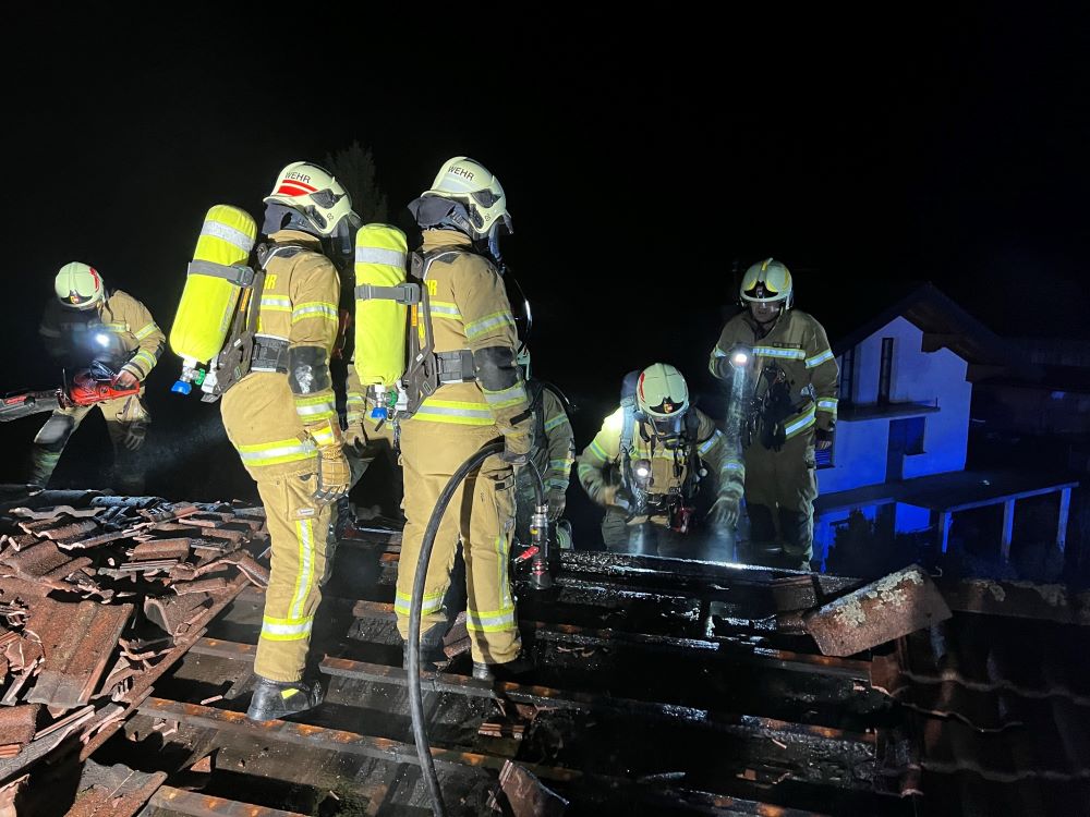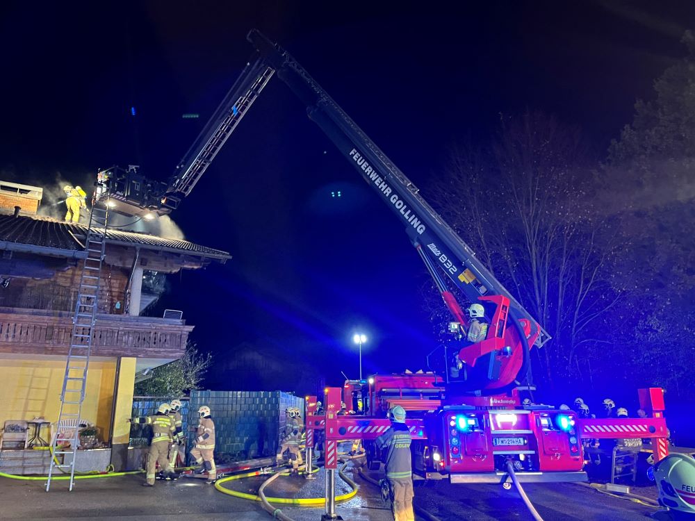 Der Brand, welcher vermutlich vom Balkon des Hauses ausging, hatte sich schon auf die Wohnung im Obergeschoß und auf den Dachstuhl ausgebreitet. Die Feuerwehr Golling unterstützte die Löscharbeiten mit einem Atemschutztrupp und der Teleskopbühne. Nach rund 45 Minuten war der Brand unter Kontrolle und es wurden noch Nachlöscharbeiten mit der Teleskopbühne im Bereich des Dachstuhles durchgeführt.