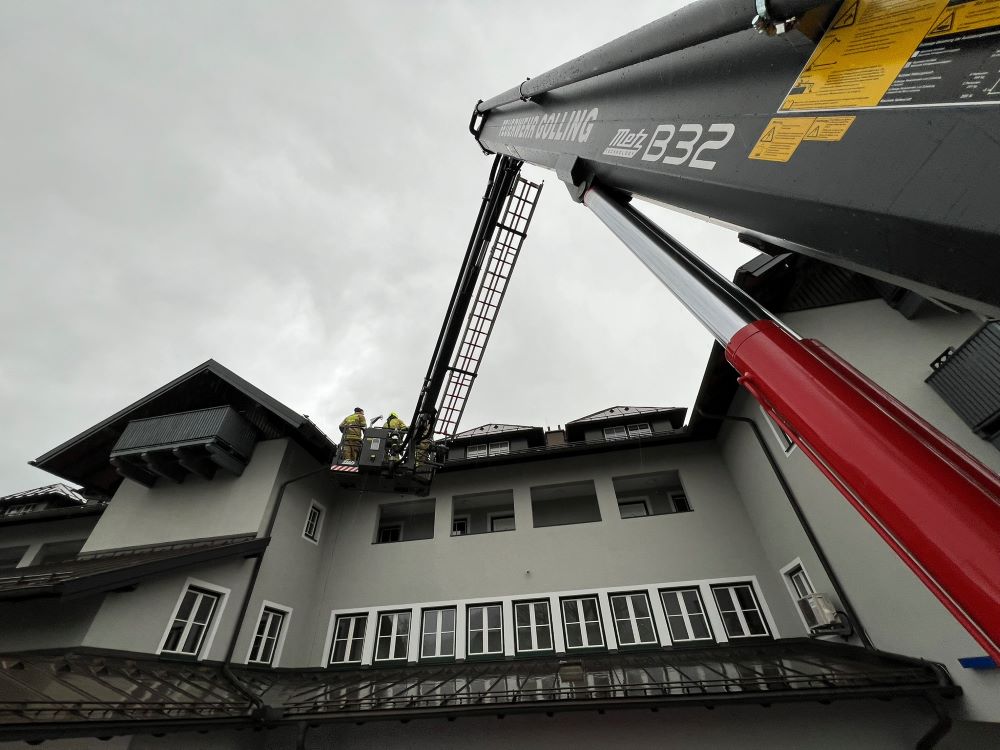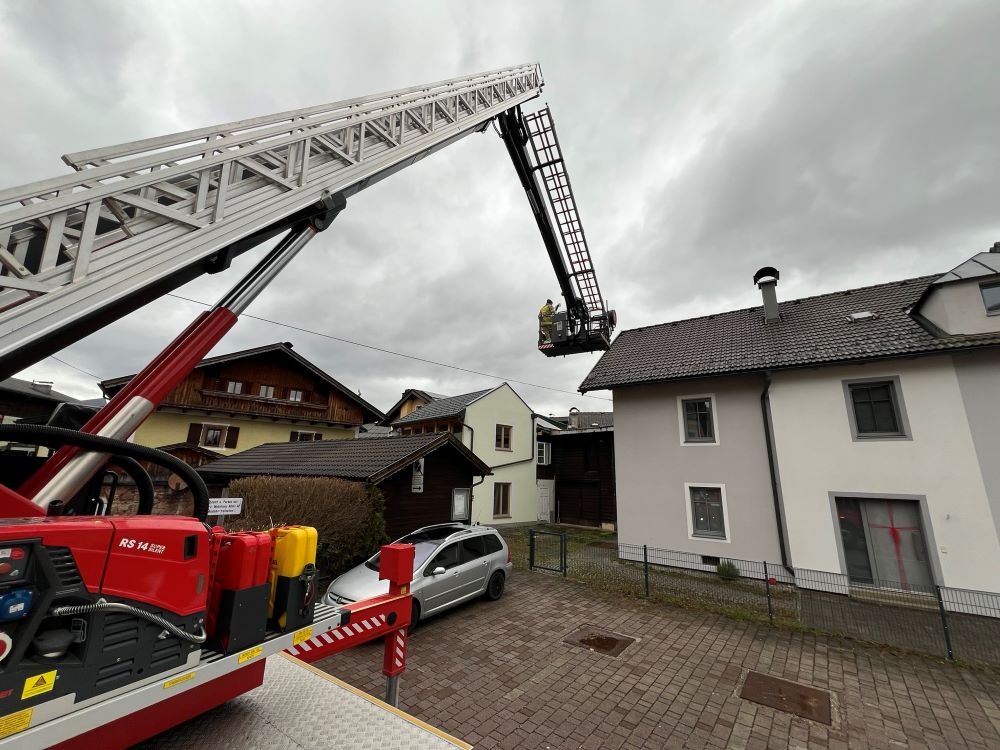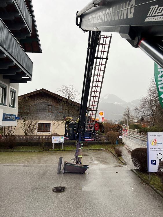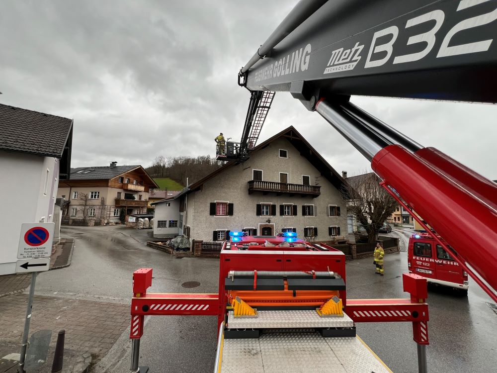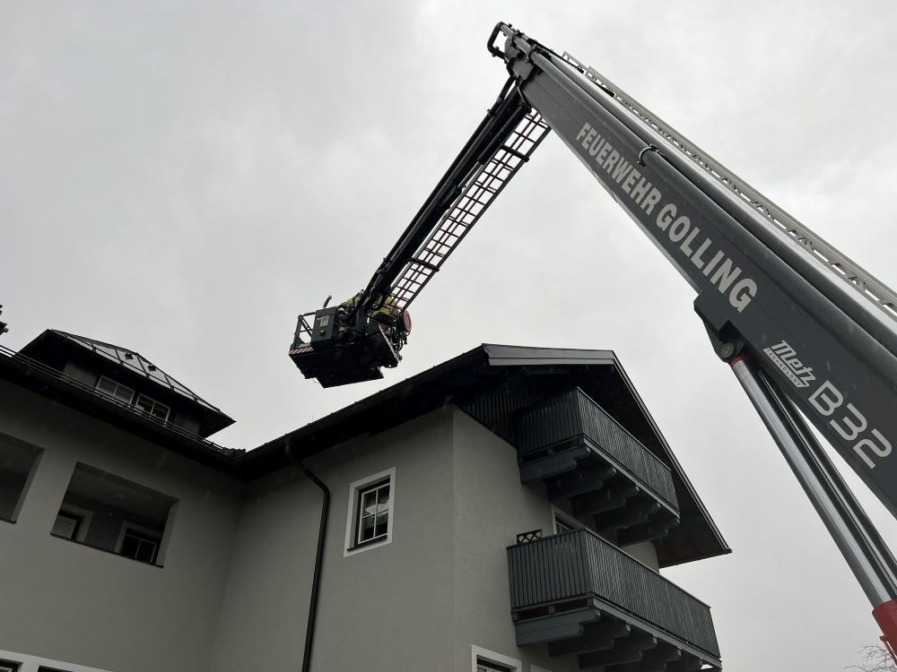 Bei einem Haus in Oberalm hatte der starke Wind einen ganzen Kamin aus seiner Verankerung gerissen und drohte herunterzufallen. Mittels Bühne Golling wurde der Kamin, ohne dabei weitere Schäden zu verursachen, auf den Boden transportiert.