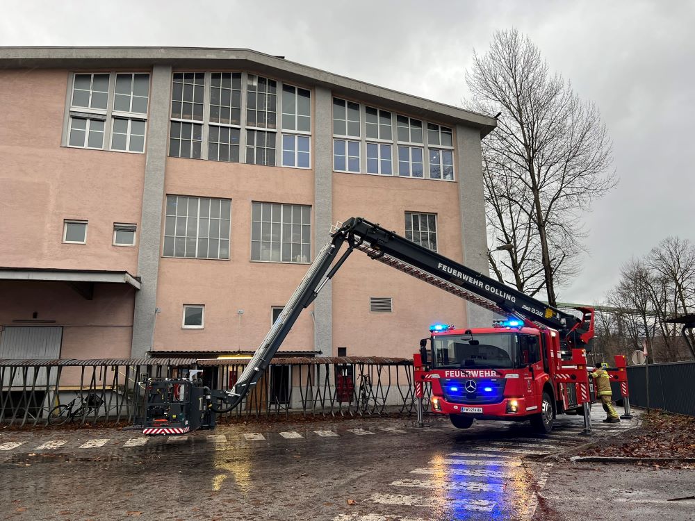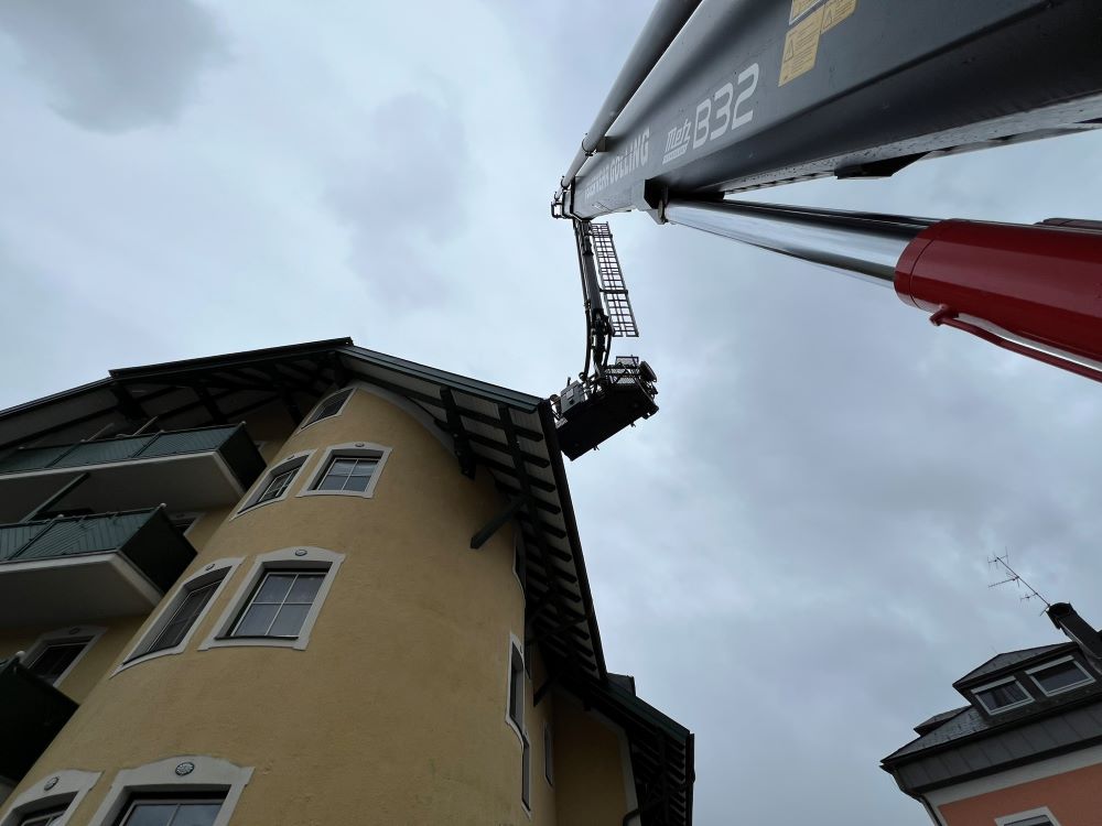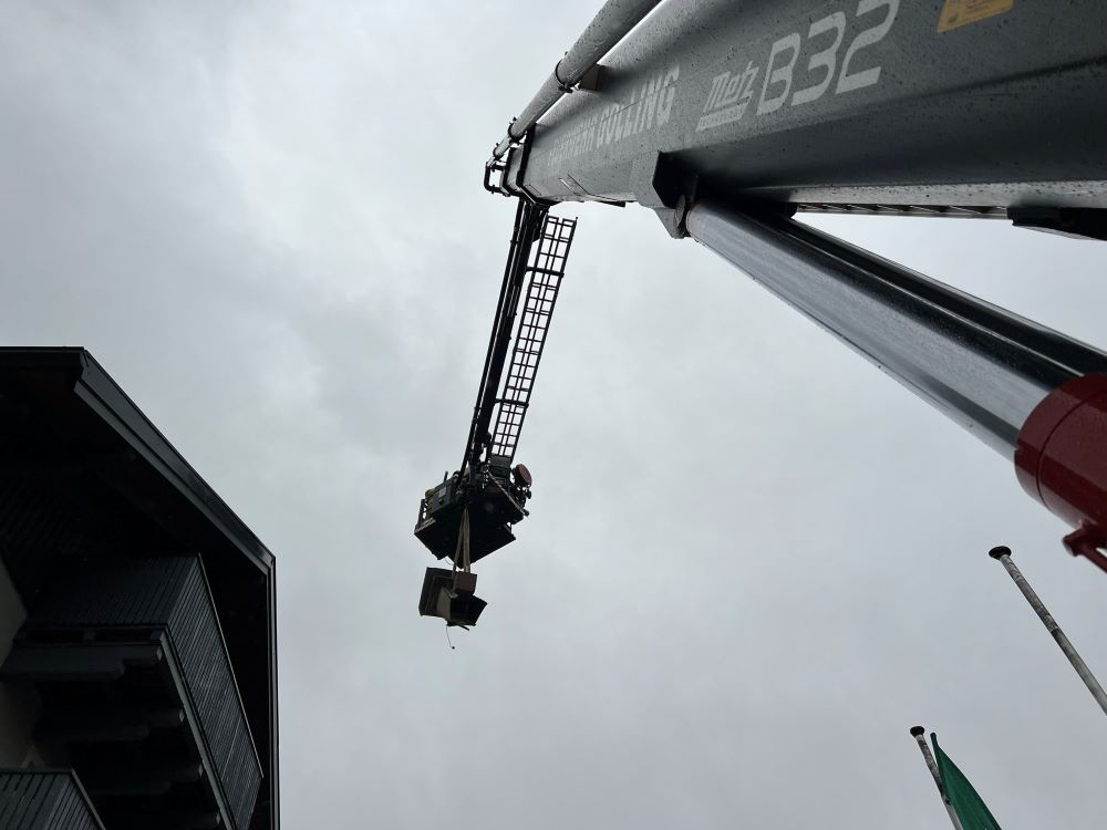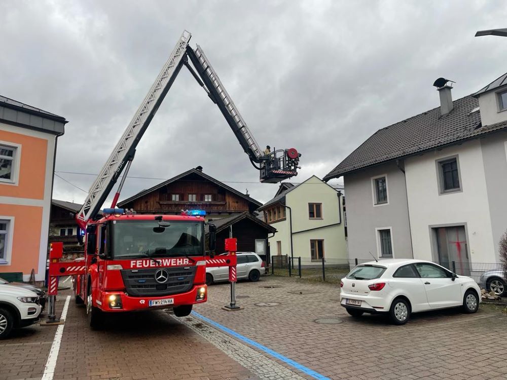 Bei einem Haus in Oberalm hatte der starke Wind einen ganzen Kamin aus seiner Verankerung gerissen und drohte herunterzufallen. Mittels Bühne Golling wurde der Kamin, ohne dabei weitere Schäden zu verursachen, auf den Boden transportiert.