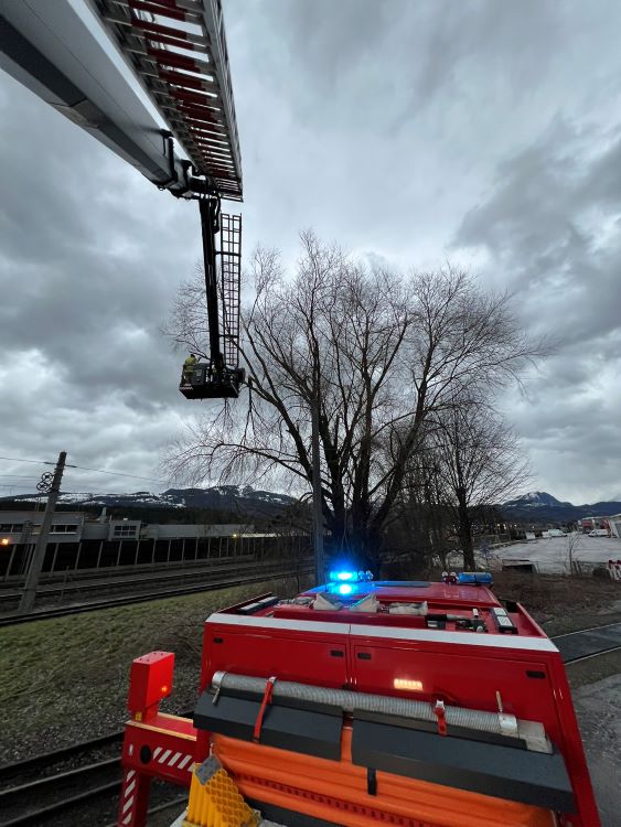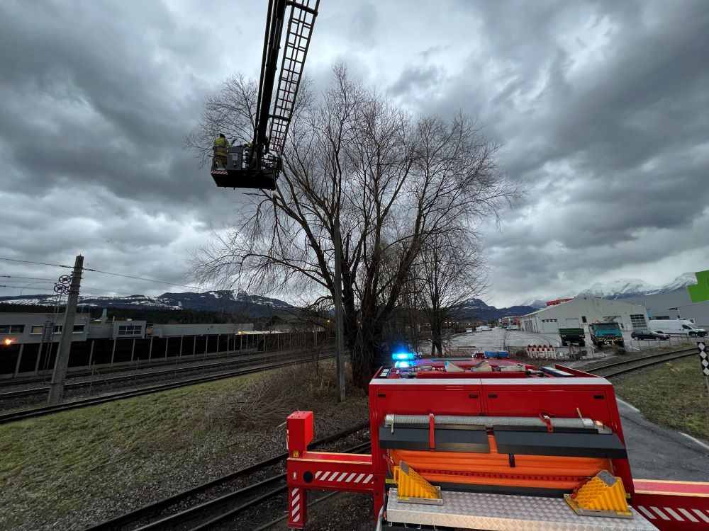 Am Betriebsgelände der Firma AustroCel mussten noch teilweise abgebrochen Äste eines Baumes entfernt werden, da diese auf die Gleise der ÖBB bzw. der werkseigenen Gleise abzustürzen drohten.