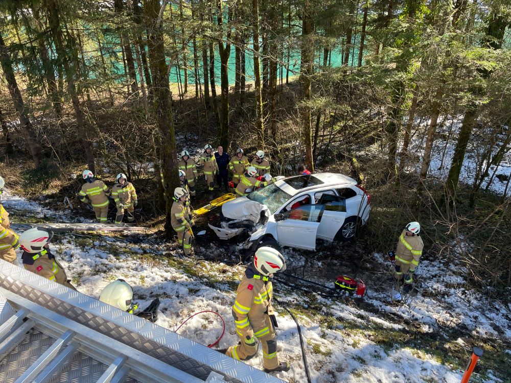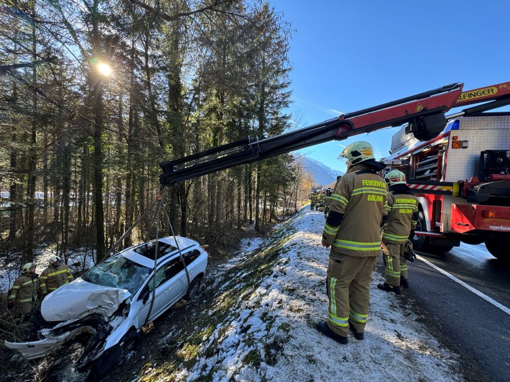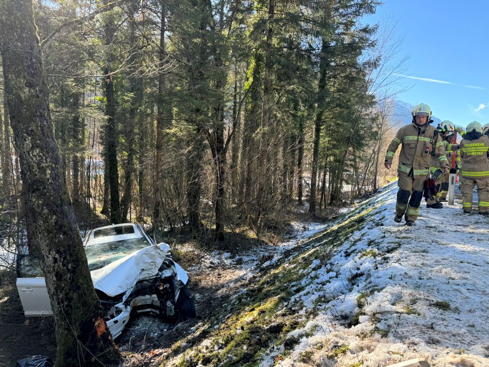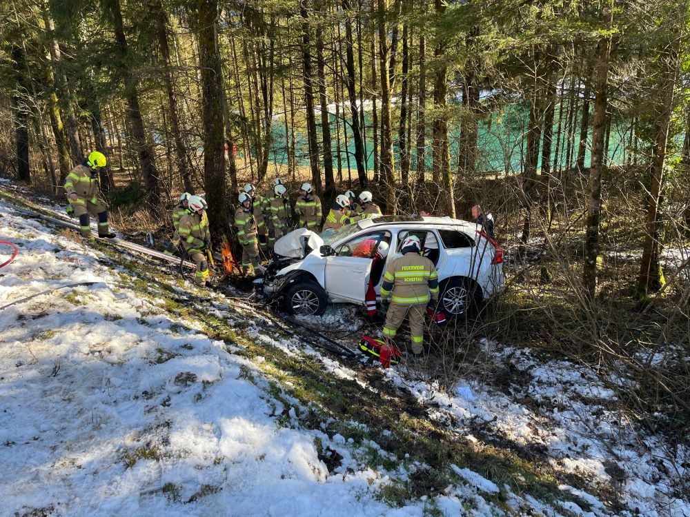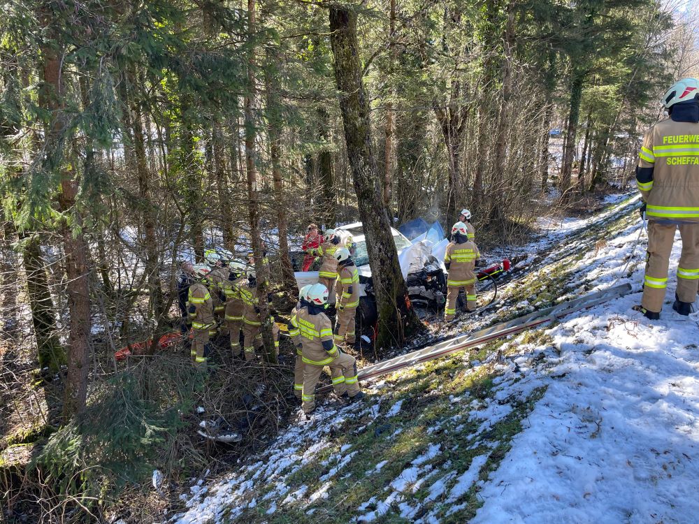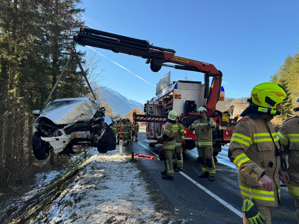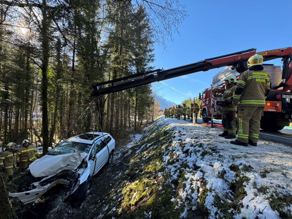 Ein PKW touchierte eine Verkehrsinsel, kam danach von der Straße ab und prallte mit hoher Geschwindigkeit gegen einen Baum im Straßengraben. Da davon ausgegangen wurde, dass drei zum Teil schwer verletzte Personen im Fahrzeug eingeklemmt sind, wurde Rüst Golling mit dem hydraulischen Rettungsgerät zum Einsatz nach Scheffau gerufen, um die Verletzten parallel aus dem Auto zu befreien. Vor Ort angekommen, führten die Kräfte der Feuerwehr Scheffau bereits die Menschenrettung durch. Eine Unterstützung mit Spreizer und Schere aus dem schweren Rüstfahrzeug aus Golling war somit nicht notwendig. Nachdem die Menschenrettung erfolgreich beendet und die Verletzten an das Rote Kreuz übergeben werden konnten, wurden Aufräumarbeiten durchgeführt. Dabei lag das Hauptaugenmerk der Einsatzkräfte aus Golling auf der Bergung des verunfallten Fahrzeuges. Der PKW wurde mit dem Kran vom Rüstfahrzeug aus dem Graben gehoben und direkt dem Abschleppunternehmen übergeben.