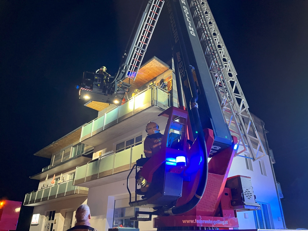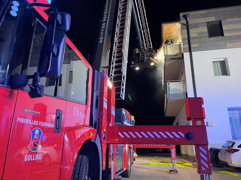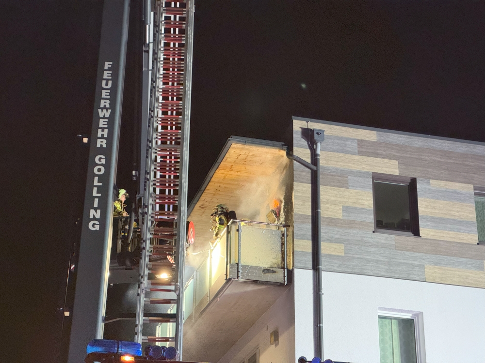 Zu einem Balkonbrand wurde die Feuerwehr Golling an diesem Sonntag um 03:35 Uhr alarmiert. 35 Mann mit fünf Fahrzeugen rückten innerhalb kürzester Zeit zum Brandeinsatz aus.