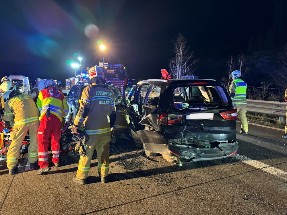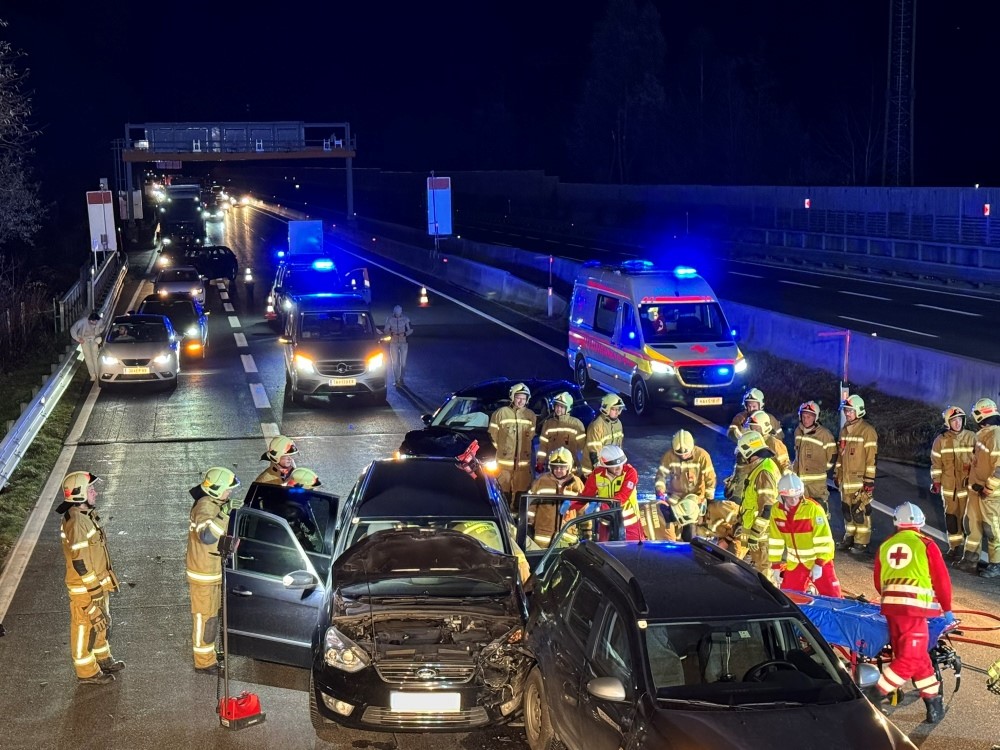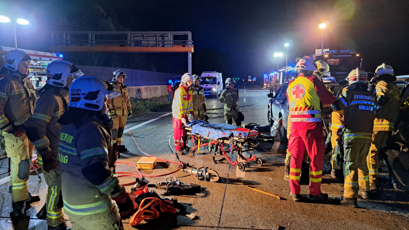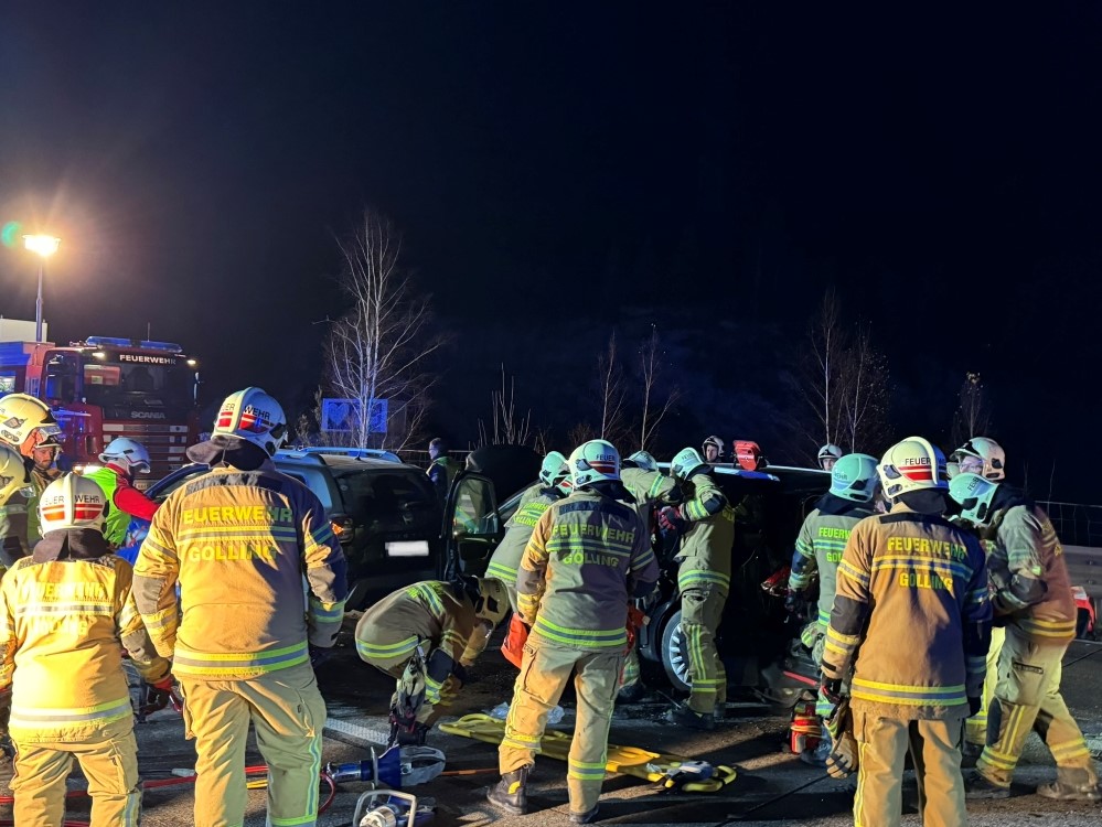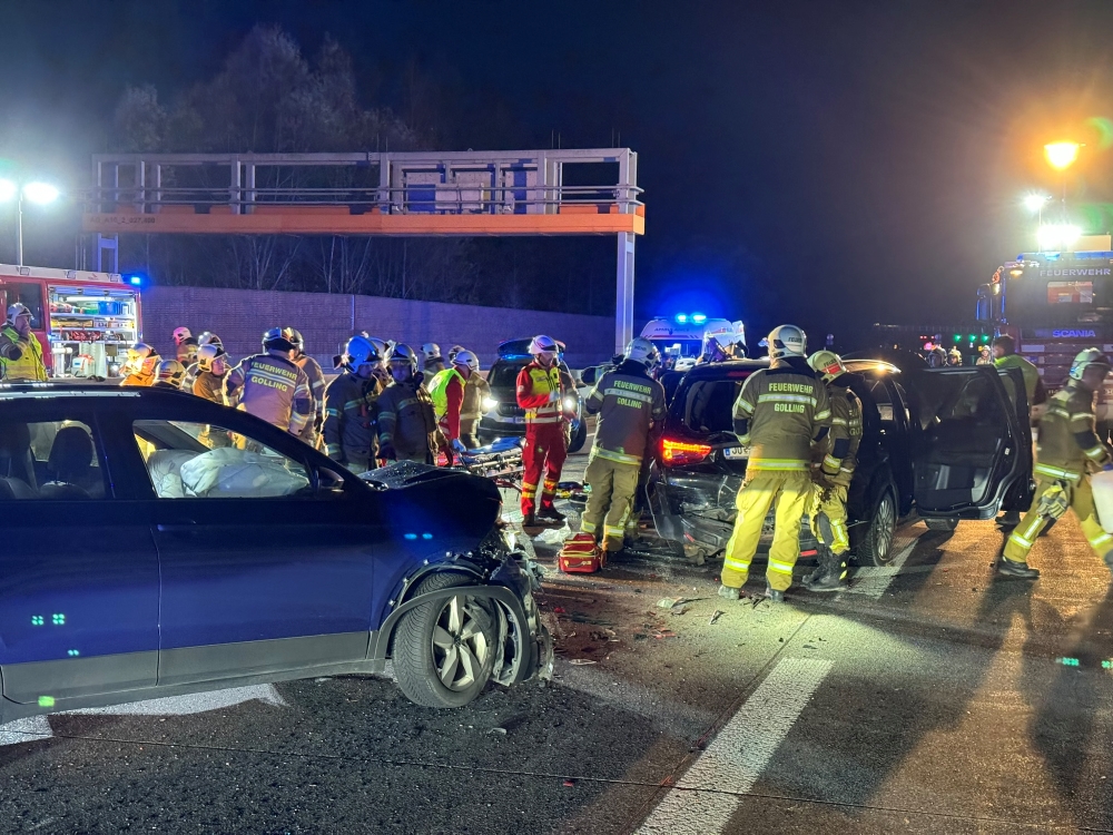 Innerhalb kürzester Zeit rückten erneut 40 Mann mit fünf Fahrzeugen zum Einsatz auf die Autobahn aus. Vor Ort angekommen, wurde eine ersten Lageerkundung durch den Einsatzleiter durchgeführt, um die nachrückenden Kräfte instruieren zu können. Ebenfalls bereits an der Einsatzstelle waren die Traffic Manager (Asfinag) welche Ersthilfe beim Verletzten leisteten und die Autobahn sperrten, damit eine sichere Zufahrt der Feuerwehrfahrzeuge entgegengesetzt der eigentlichen Fahrtrichtung möglich war. Es handelte sich um einen Auffahrunfall mit drei Fahrzeugen, wobei im mittleren PKW eine Person mit Verletzungen unbestimmten Grades eingeschlossen war. Parallel zur Erstversorgung des Verletzten durch das Rote Kreuz, führten die Kräfte der Feuerwehr die Öffnung des Fahrzeuges mit dem hydraulischen Rettungsgerät durch. Im Anschluss konnte eine schonende Rettung des Verletzten durchgeführt werden. Die Unfallstelle wurde abgesichert, ein Brandschutz errichtet sowie auslaufende Betriebsmittel gebunden. Nach den Aufräumarbeiten wurden die beschädigten Fahrzeuge an ein Abschleppunternehmen übergeben. Die Polizei gab die Fahrbahn wieder für den Verkehr frei und der Einsatz der Feuerwehr Golling konnte beendet werden. Ein großes Dankeschön gilt allen anwesenden Einsatzorganisationen für die Zusammenarbeit und die professionell durchgeführte Menschenrettung und Hilfeleistung.