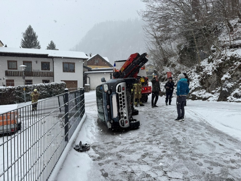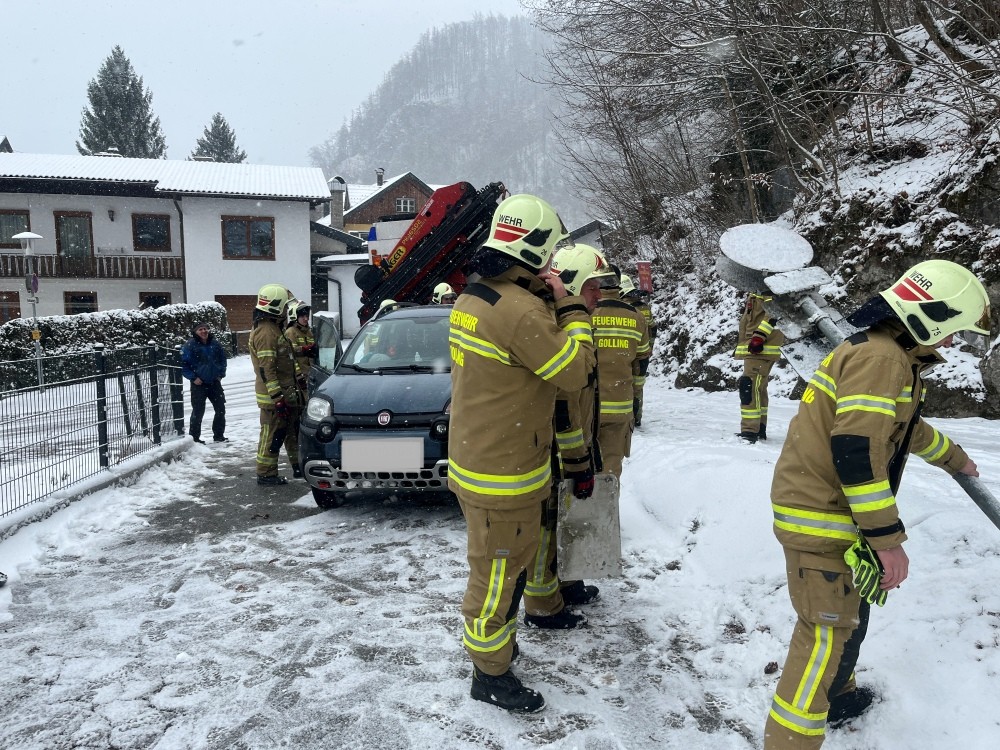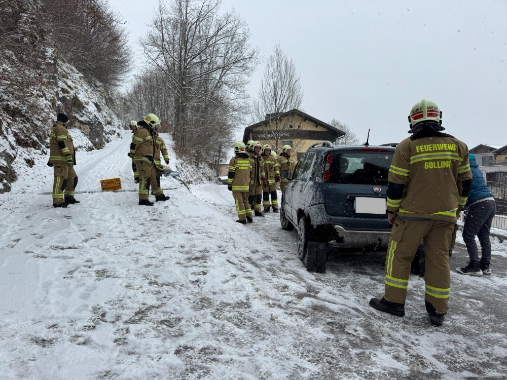 Die Feuerwehr Golling wurde am Dienstag um 13:02 Uhr zu einer Fahrzeugbergung in der Trögergasse alarmiert. Laut Erstmeldung war ein Fahrzeug infolge des starken Schneefalls im Bereich der Zufahrt zum Friedhof abgestürzt.