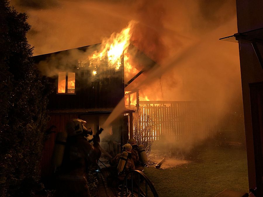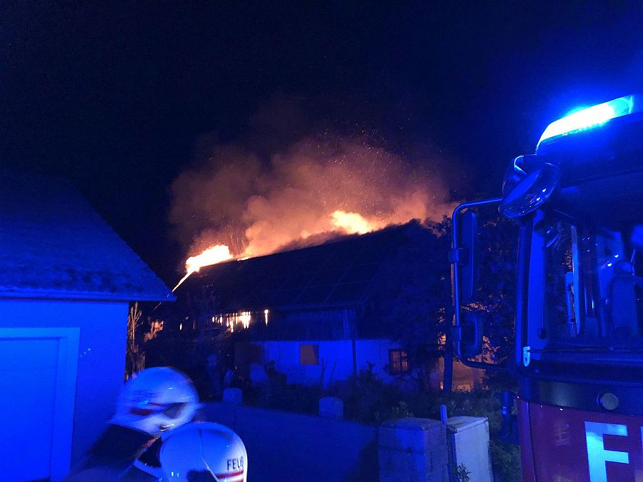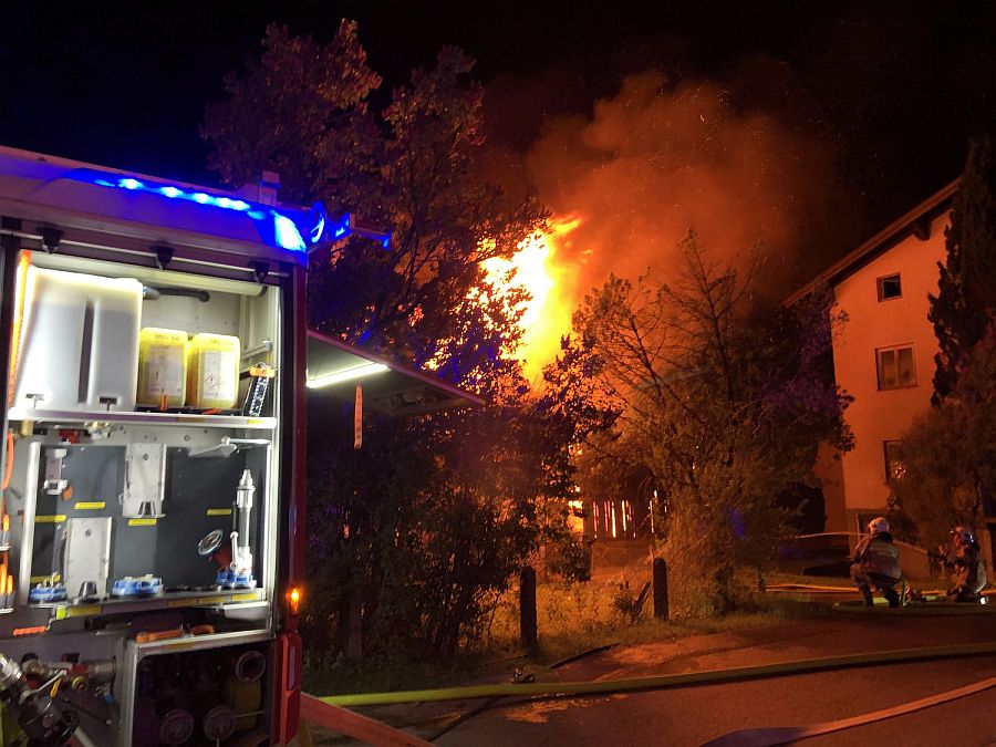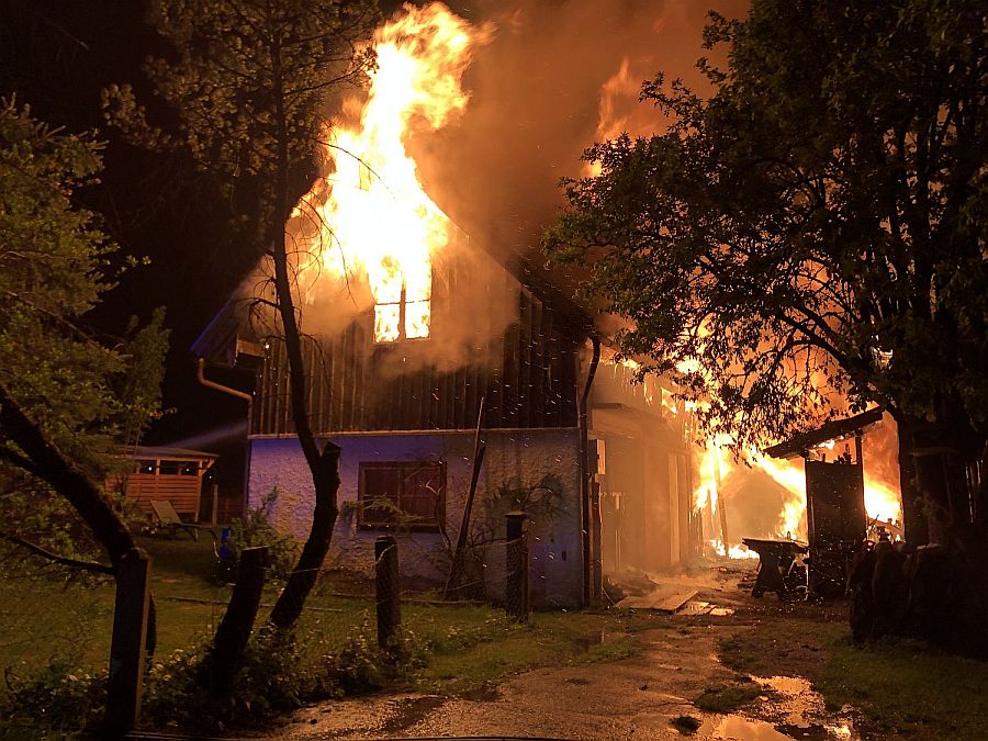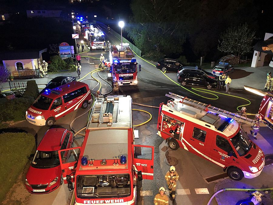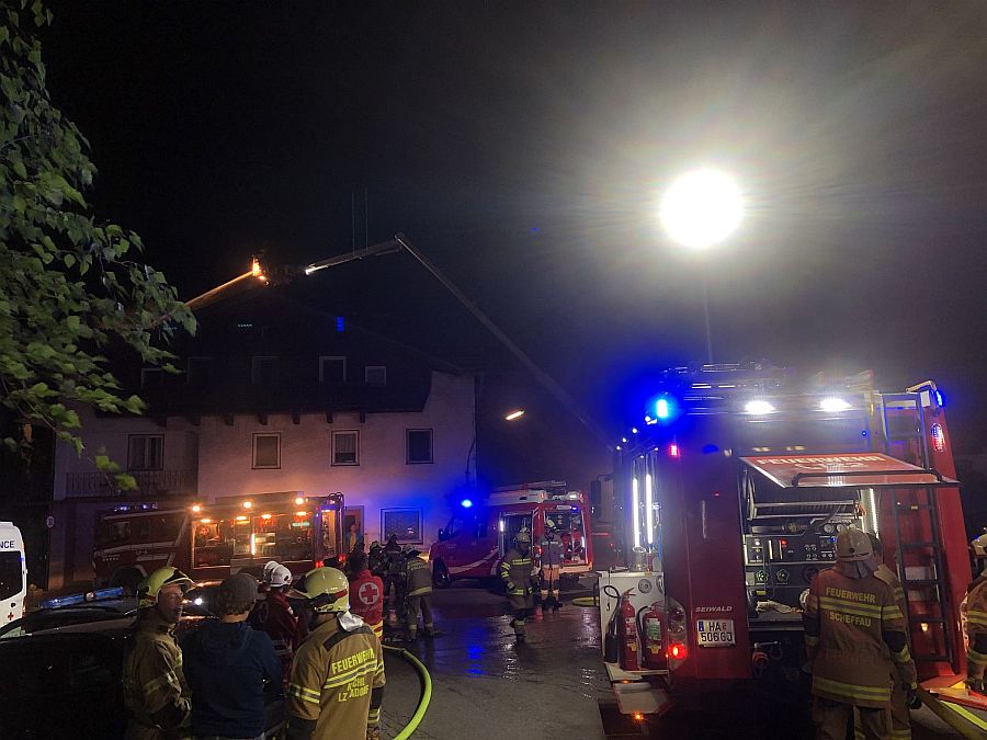 Der eintreffende Einsatzleiter OBI Christoph Rettenbacher stellte sofort nach einer ersten Erkundung eine enorme Gefährdungslage für die sehr nahe angrenzenden Wohnhäuser fest, starker Wind sorgte zudem für massiven Funkenflug. Aus diesem Grund wurden sofort die benachbarten Feuerwehren Kuchl und Scheffau durch Alarmstufe 3 angefordert.