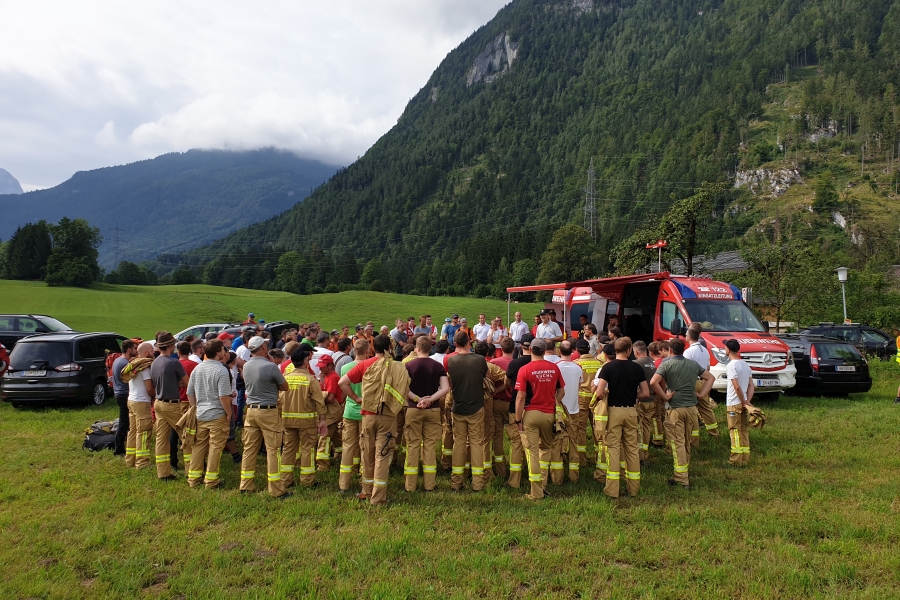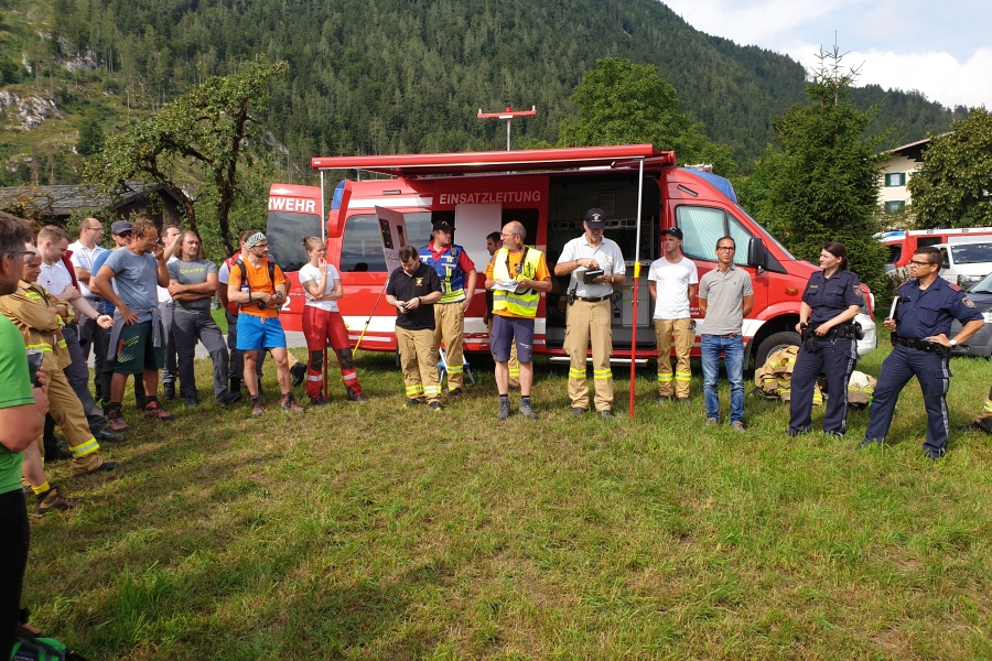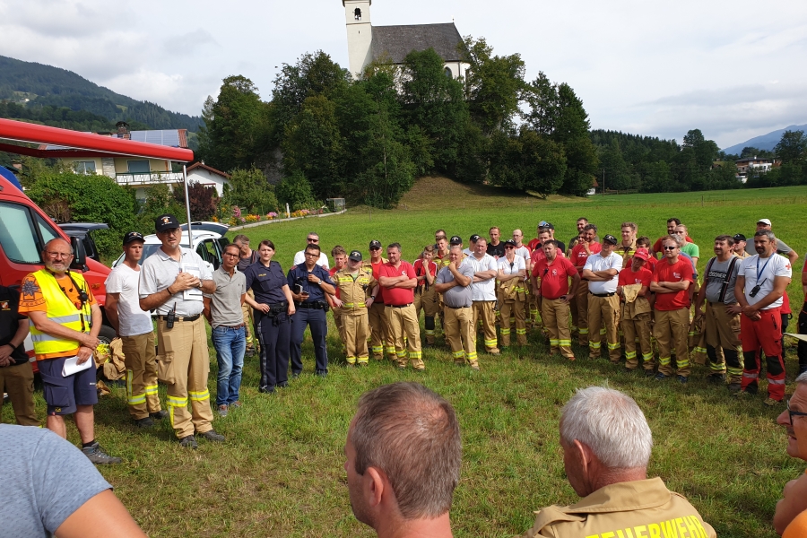 Am Sonntag, den 28.07.2019 trat die Einsatzleitung um 07.00 Uhr pünktlich zusammen. Starke Kräfte der Feuerwehr Kuchl mit dem Löschzug Jadorf sowie weitere Einheiten der Bergrettung und des Roten Kreuzes mit den Spürhunden wurden in 4 gemischte Suchgruppen aufgeteilt. Damit sollte das Gelände westlich der Salzach zwischen dem Ausgang des Bluntautales bis zur Kuchler Salzachbrücke strukturiert und lückenlos abgesucht werden. Zur Unterstützung der Einsatzleitung vor Ort wurde auch das Einsatzleitfahrzeug des Bezirkes Tennengau der Feuerwehr angefordert.