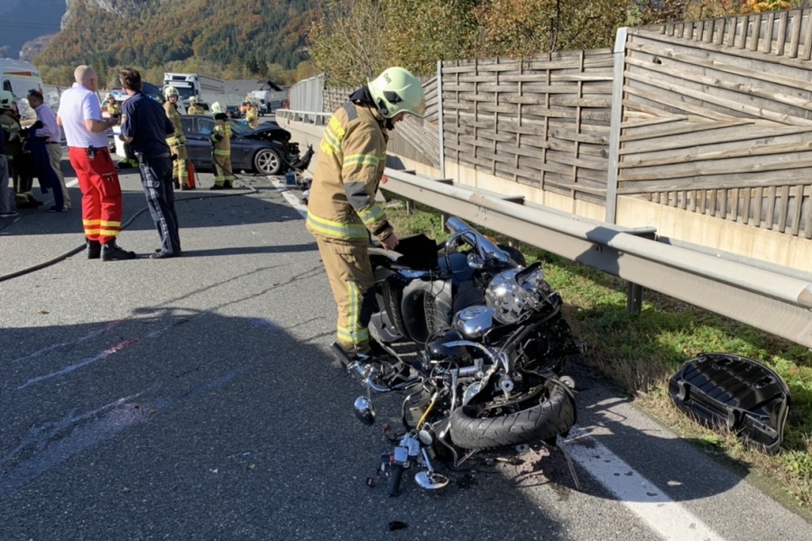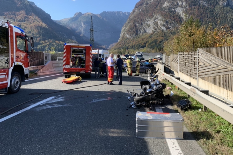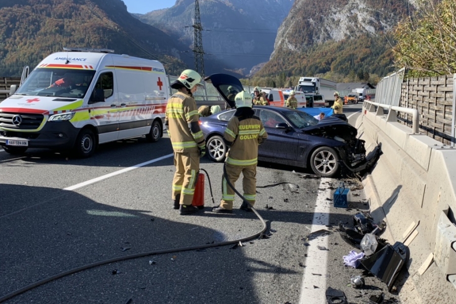 Gegen 11:30 wurde für die Feuerwehr Golling mit Sirene und Rufempfänger zu einem Verkehrsunfall alarmiert. Kurz darauf rückten vier Fahrzeuge mit 22 Mann zur nahegelegenen Unfallstelle aus. Auf dem Autobahnzubringer waren ein PKW mit drei Insassen und ein Motorradfahrer frontal aufeinandergeprallt. Beim Eintreffen der FF Golling war der erste Rettungswagen bereits vor Ort.
