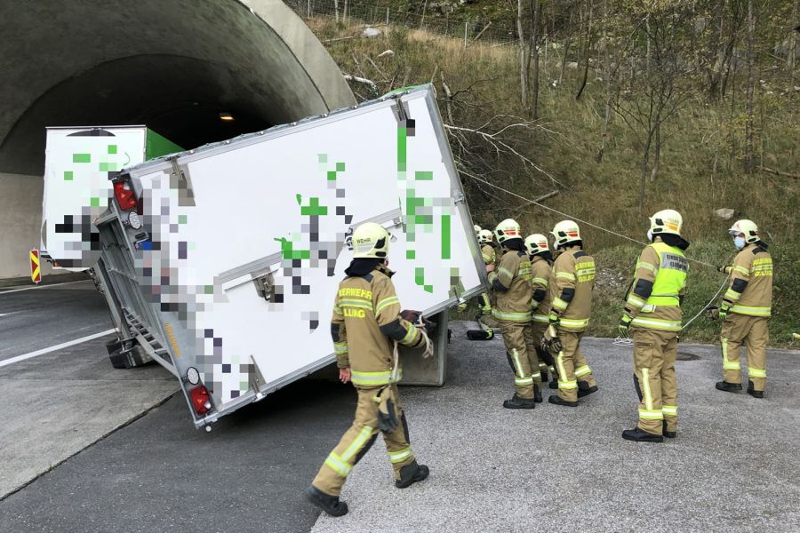 Ein leerer LKW Anhänger (ca. 1700kg) wurde durch eine Windböe unter der Fahrt so in Schieflage versetzt, dass er schlussendlich auf einem Aufprallschutz (diese stehen vor jedem Tunnelportal) zum liegen kam. Nach Alarm um 08:38 Uhr rückte die Feuerwehr mit 4 Fahrzeugen und 25 Mann (unter Einhaltung der aktuellen Covid 19 Maßnahmen) zur Unfallstelle aus.