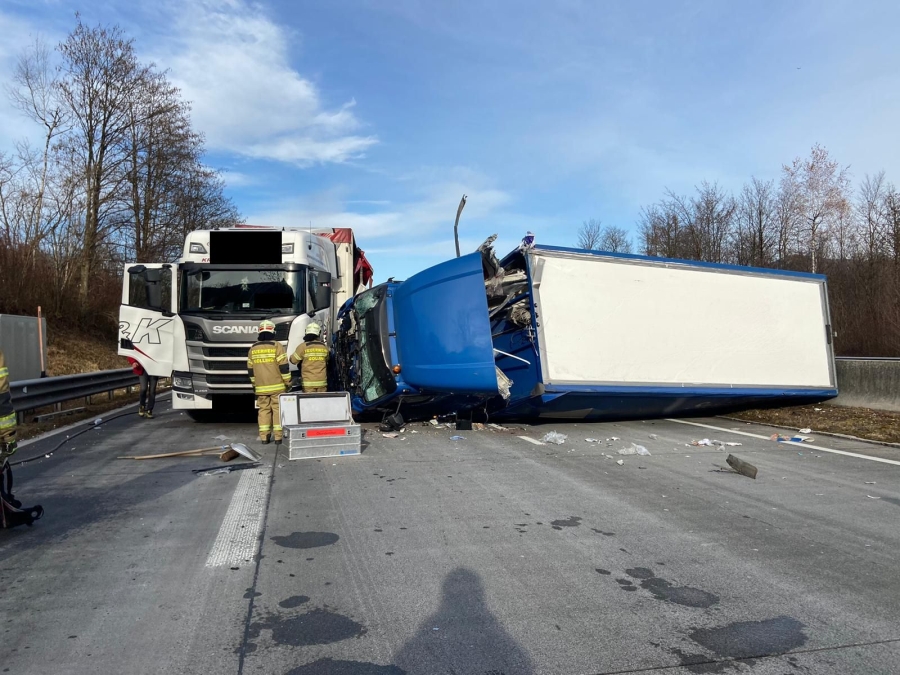 Beide Fahrer wurden bei diesem Unfall, zum Glück, nur leicht verletzt. Umso aufwändiger zeigte sich die Bergung der LKWs und die Reinigung der Fahrbahn.