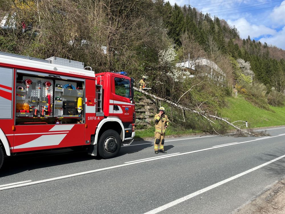 Zu zwei Einsätzen gleichzeitig wurde die Feuerwehr Golling am Ostersonntag alarmiert. Aufgrund des starken Windes stürzte ein Baum auf die Bundesstraße B162, parallel dazu musste eine Person aus einem öffentlichen WC befreit werden.