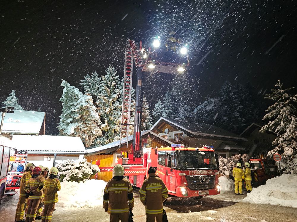 Am Samstag um kurz vor 18 Uhr wurde die technische Gruppe der Feuerwehr Golling zu einer Hilfeleistung mit der Teleskopbühne nach Adnet Waidach alarmiert. Ein Baum drohte, aufgrund der massiven Schneelast, auf das Dach eines Hauses zu stürzen.