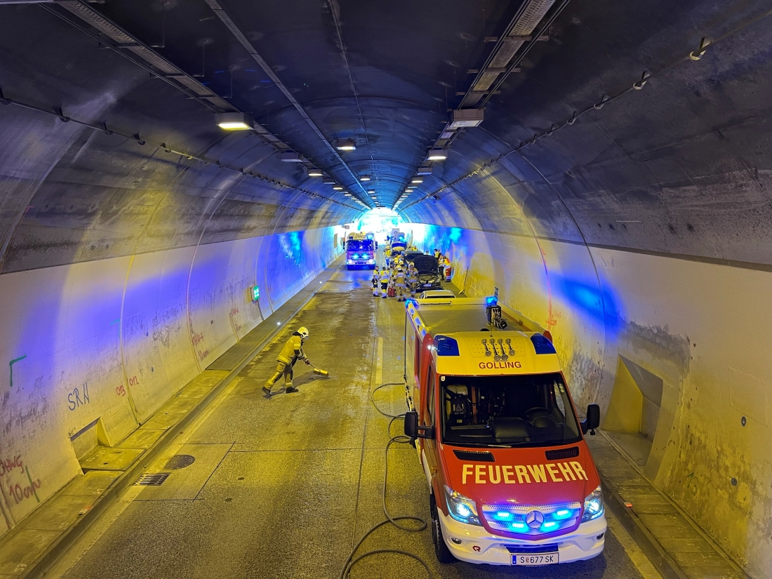 An diesem Freitagnachmittag wurde die Feuerwehr Golling um 15:09 Uhr zu einem Verkehrsunfall im Ofenauertunnel alarmiert. Drei Fahrzeuge kollidierten miteinander im Bereich des Tunnelportals. Bis zur Ankunft an der Unfallstelle war unklar, ob noch Menschen in ihren Fahrzeugen eingeklemmt sind. Vor Ort stellte sich glücklicherweise heraus, dass es sich nur um einen Auffahrunfall mit mehreren Fahrzeugen und ohne Personenschaden handelte.
