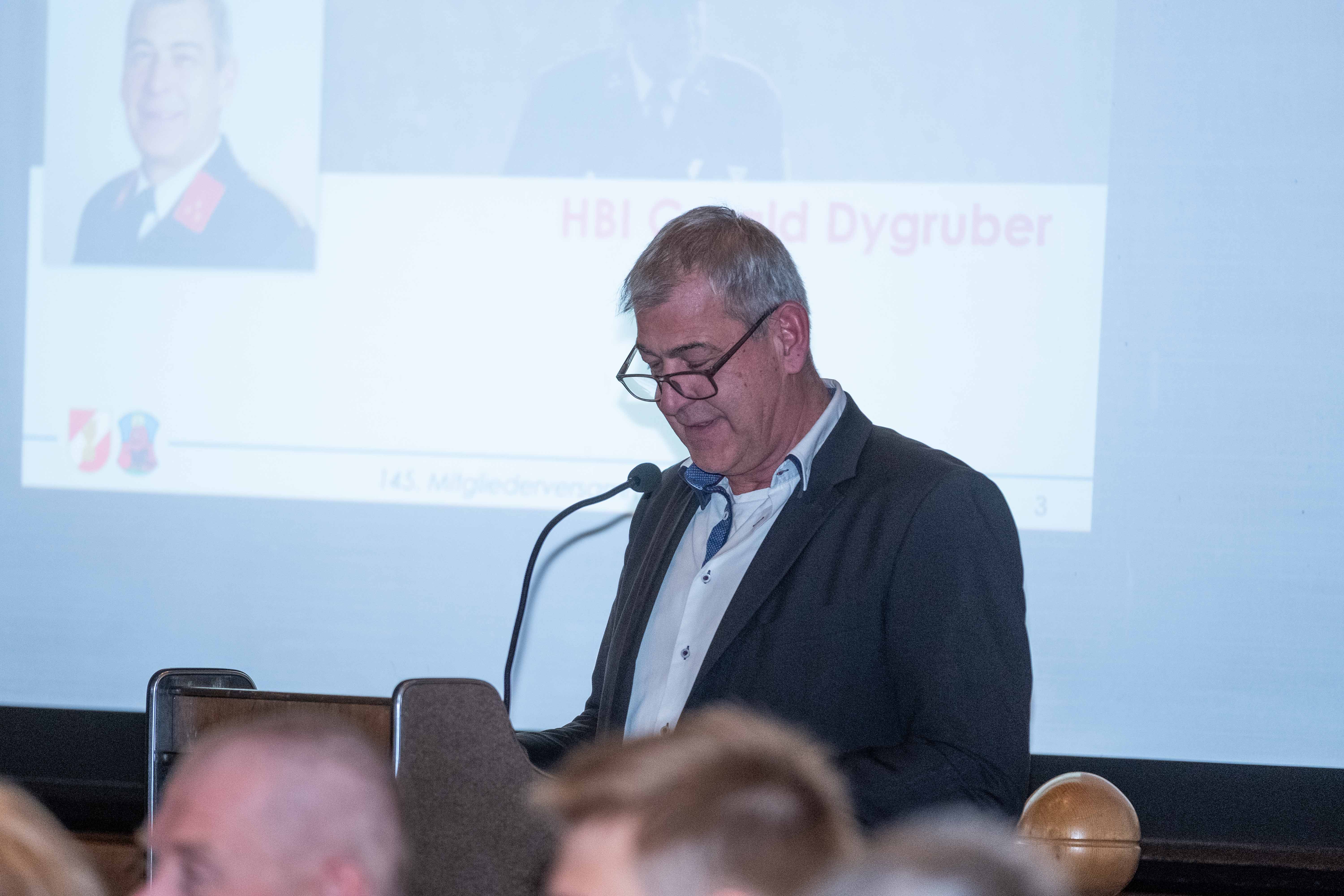 Ortsfeuerwehrkommandant Gerald Dygruber durfte wieder zahlreiche Ehrengäste begrüßen, unter anderem Bürgermeister Peter Harlander, Vizebürgermeister Stephan Loidl, Gemeinderat Martin Dietrich und Abschnittsfeuerwehrkommandant BR Rupert Unterwurzacher, sowie Ehrenortsfeuerwehrkommandant Erich Hettegger und Ehrenbezirkskommandant Nikolaus Brandauer.