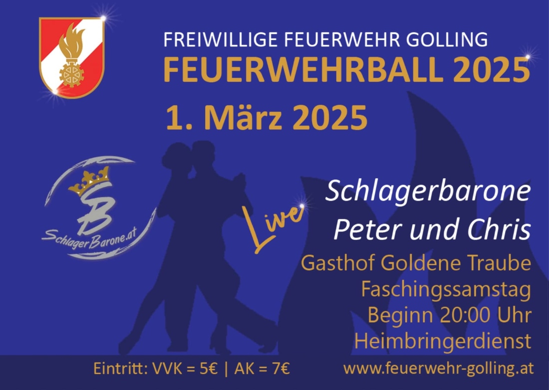 Am Faschingssamstag, dem 1. März 2025, fand der traditionelle Feuerwehrball der Freiwilligen Feuerwehr Golling statt. Zahlreiche Gäste aus der Gemeinde und Umgebung sowie Vertreter aus Politik, Feuerwehrwesen und dem Roten Kreuz folgten der Einladung und verbrachten einen geselligen Abend beim Gasthaus Goldene Traube.