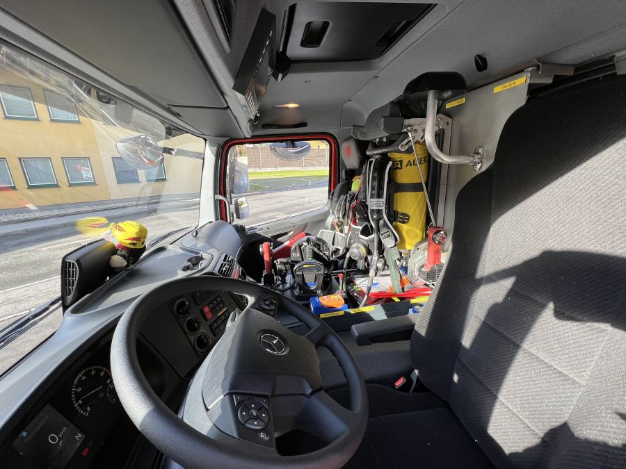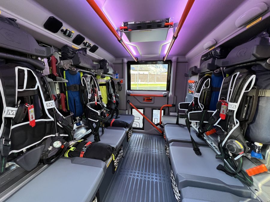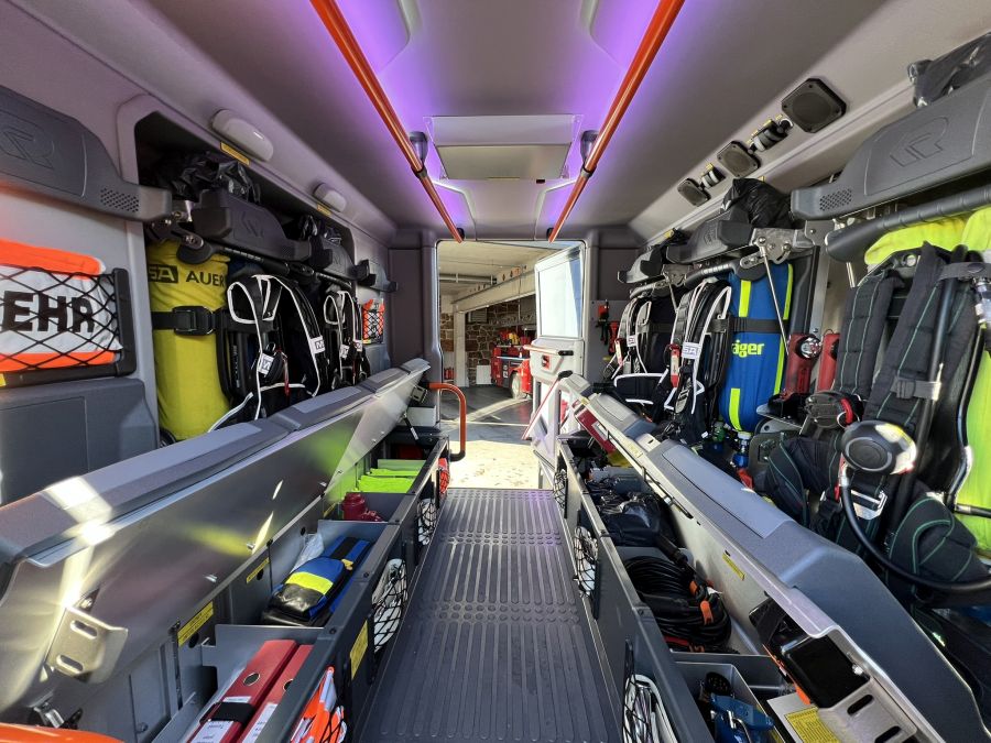 - 7 Stk. Atemschutzgeräte MSA M1"Twin Pack" , davon jeweils 1 Stk. im Beifahrersitz für den Fahrzeugkommandanten und 1 Stk. zwischen Fahrersitz und Beifahrersitz für den Maschinisten.
