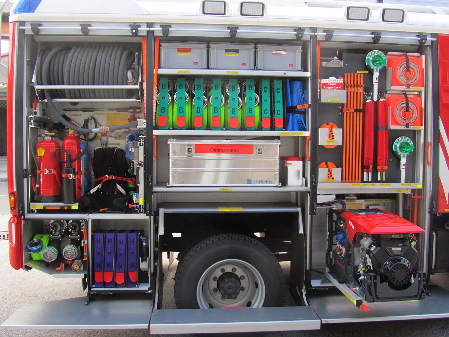 3000 Liter Wasser, 100 Liter Schaummittel, Einbaupumpe, Hochdruck-Schnellangriffseinrichtungen mit 90m und 60m, wasserführende Armaturen, B-,C- und HD-Schläuche, Ölbindemittel, div. Werkzeug, Mehrgasspürgerät, Absperrmaterial.