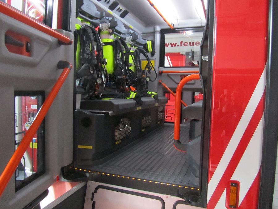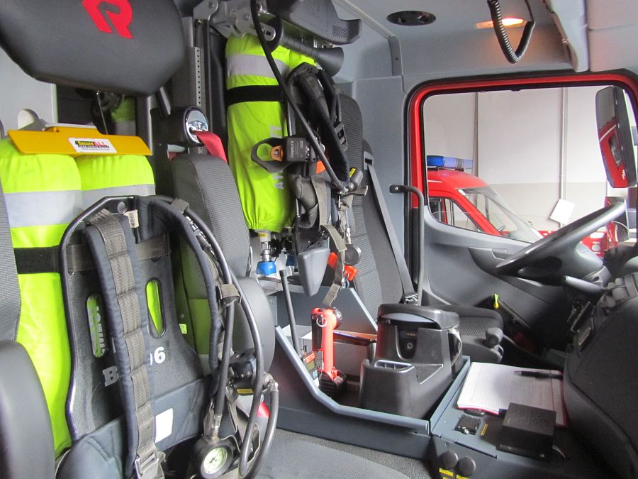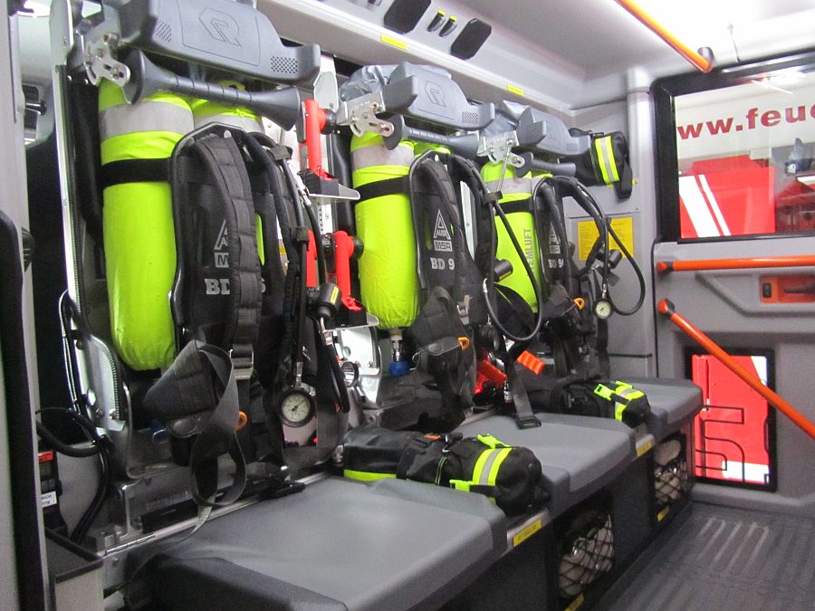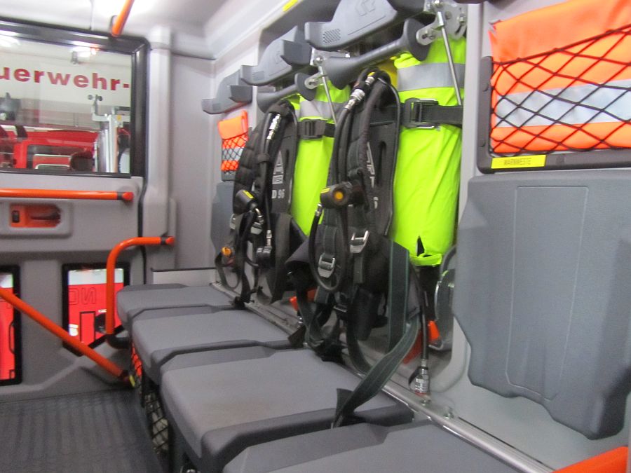 7 Stk. Atemschutzgeräte BD 96, davon jeweils 1 Stk. im Beifahrersitz für den Fahrzeugkommandanten und 1 Stk. zwischen Fahrersitz und Beifahrersitz für den Maschinisten.