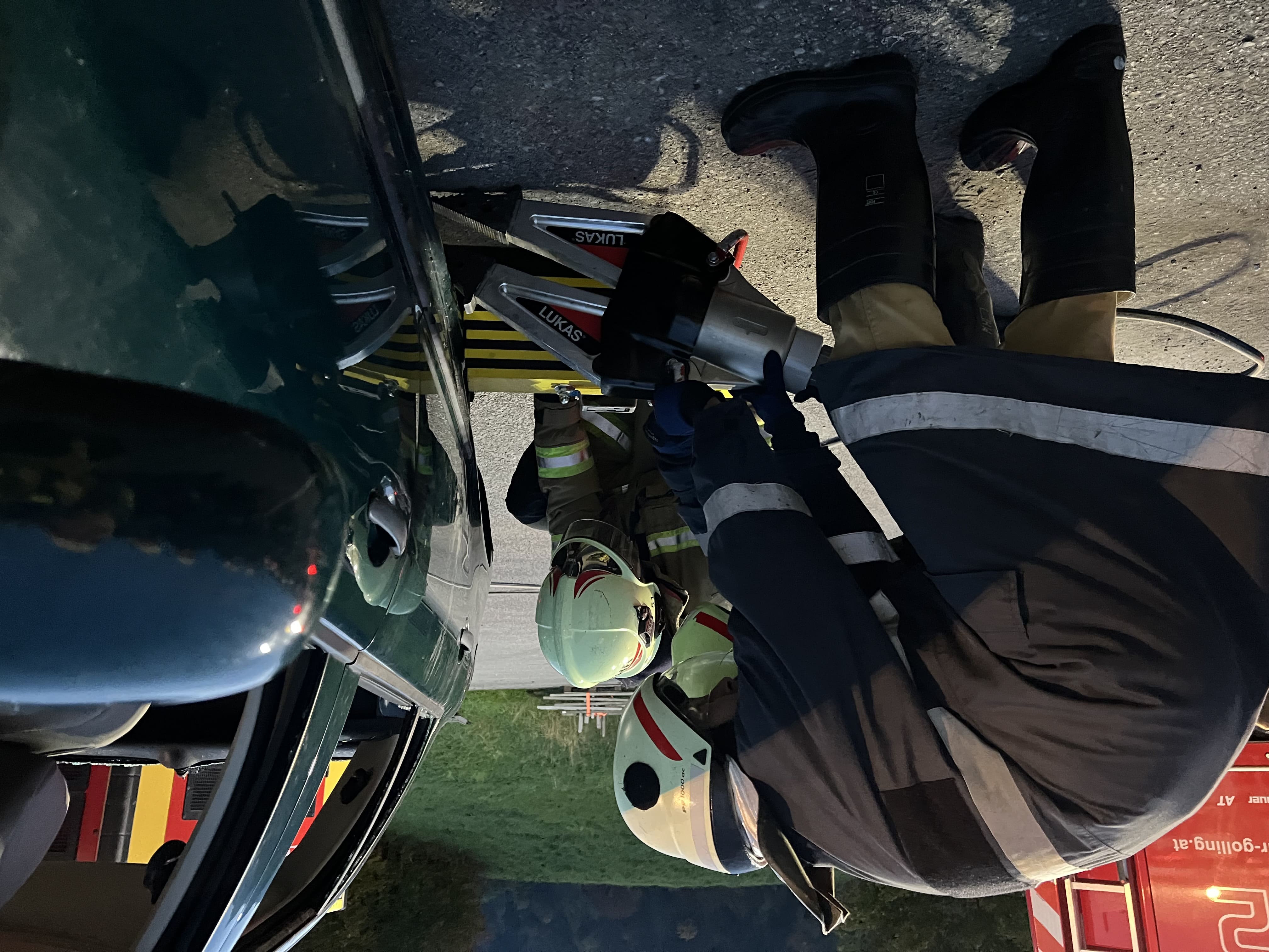 Nach einer kurzen Einschulung an den Rettungsgeräten und den Sicherheitsmaßnahmen wurde damit begonnen, das Fahrzeug sorgfältig zu "zerlegen". Jeder Schnitt wurde besprochen, um ein effizientes Ergebnis zu erzielen - Spreitzer, Schere, Glasschneider und der Kran unseres schweren Rüstfahrzeuges kamen bei dieser Übung zum Einsatz. Nach mehr als einer Stunde wurde diese Übung erfolgreich beendet, die verletzte Person konnte aus dem Fahrzeug befreit werden.